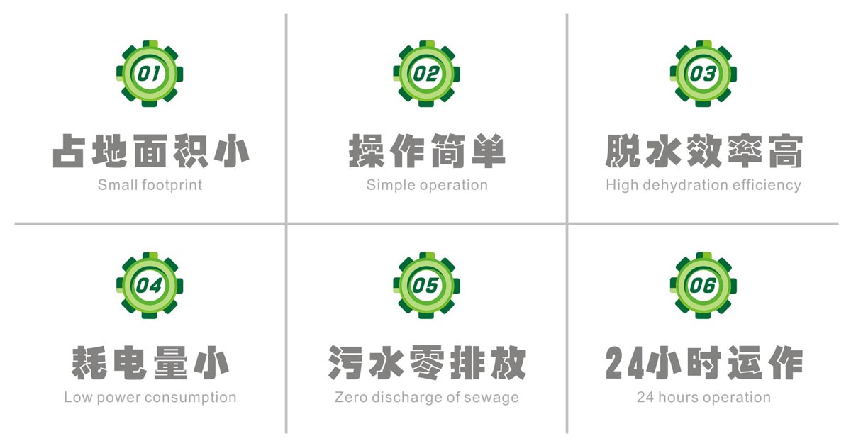 結(jié)構設計先進,占地面積小,性價比好,適合較少輕物料的處理,能耗低,運行成本低,效率高,操作維護簡單;非常適合小型用戶污泥脫水處理需求,價格實惠,脫水效率高。